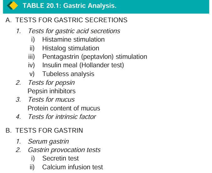 In various diseases of the stomach, the laboratory tests to measure gastric secretions (consisting of gastric acid, pepsin, mucus and intrinsic factor) and serum gastrin are of particular significance