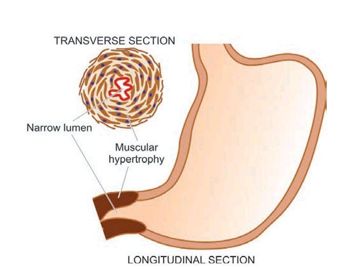 Longitudinal and transverse section of the stomach showing hypertrophy of the circular layer of the muscularis in the pyloric sphincter.
