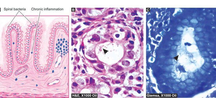 A, Diagrammatic representation. B, H&E stained section. C, Demonstration of H. pylori in Giemsa stain.
