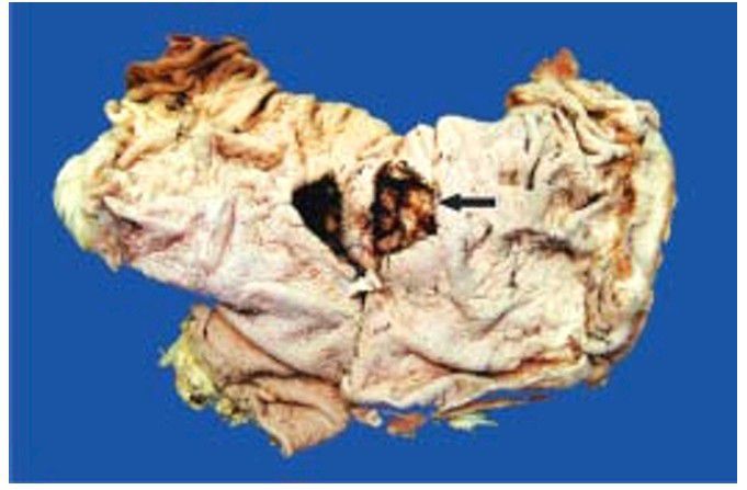 Partial gastrectomy specimen showing a punched out round to oval ulcer on the mucosa, about 1 cm in diameter (arrow) and penetrating into muscularis laye