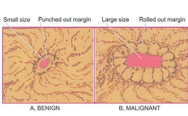Chronic gastric ulcer (A) contrasted with malignant gastric ulcer (B).