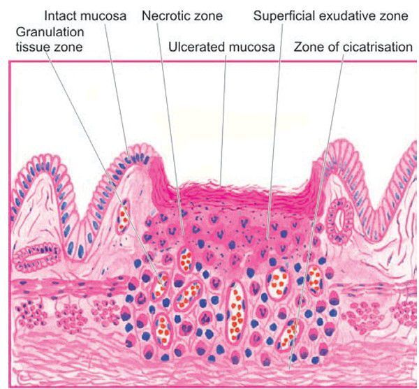 Histologic zones of the ulcer are illustrated in the diagram. The photomicrograph on right shows necrotic debris, ulceration and inflammation on the mucosal surface.