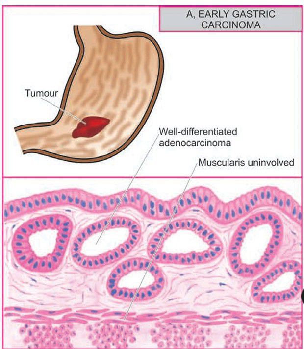 Gastric carcinoma, gross appearance of early gastric carcinoma and corresponding dominant histological patterns.