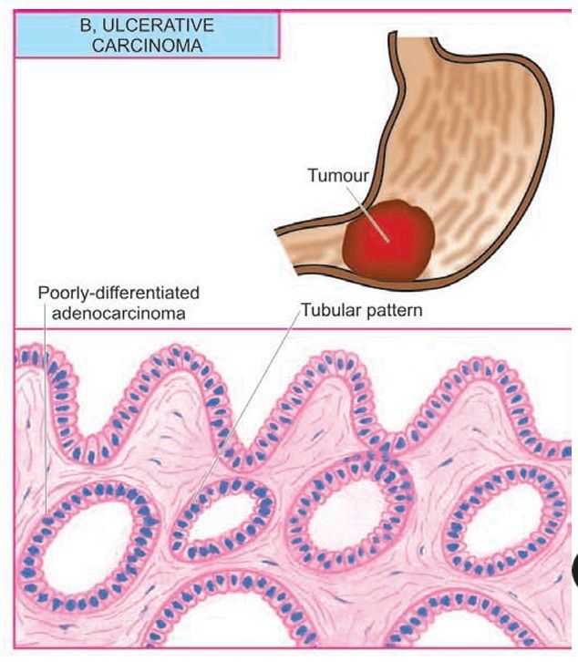 Gastric carcinoma, gross appearance of ulcerative carcinoma and corresponding dominant histological patterns.