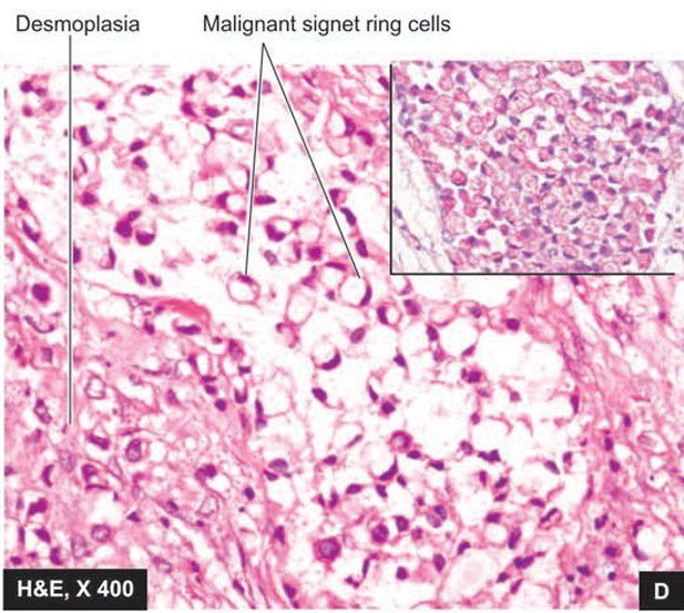. Microscopy shows characteristic signet ring tumour cells having abundant mucinous cytoplasm positive for mucicarmine. The stroma is desmoplastic.