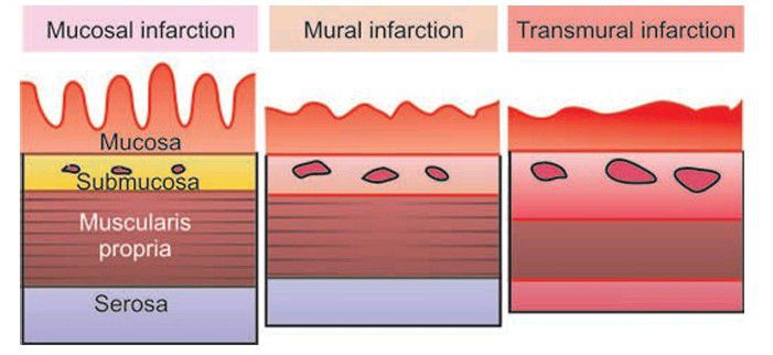 Schematic diagram to show the three types of ischaemic bowel disease depending upon the extent of involvement.
