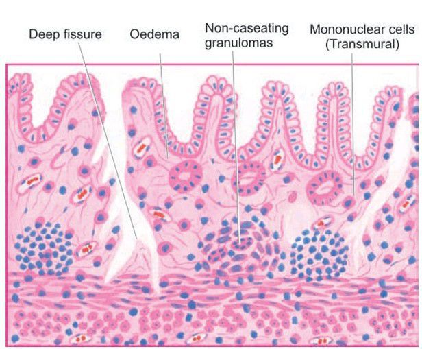 . The histological features present are: transmural chronic inflammatory cell infiltration, deep fissures into the bowel wall, submucosal widening due to oedema, some prominent lymphoid follicles and a few non-caseating epithelioid cell granulomas in the bowel wall.