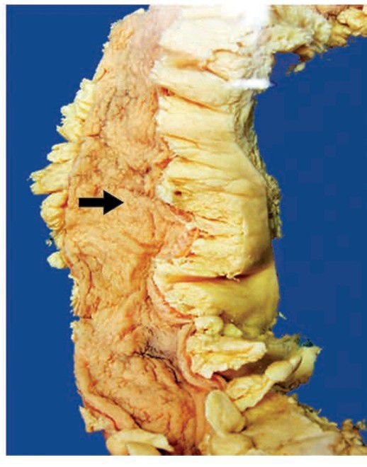 Continuous involvement of the rectum and colon without any uninvolved skip areas. The ulcers are superficial with intervening inflammatory pseudopolyps. The lumen is narrow and the haustral folds are lost giving ‘garden-hose appearance’.