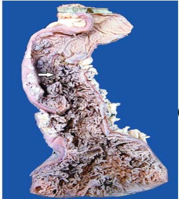 The mucosal surface is straddled with multiple polyoid structures (arrow) of varying sizes many of which are pedunculated.