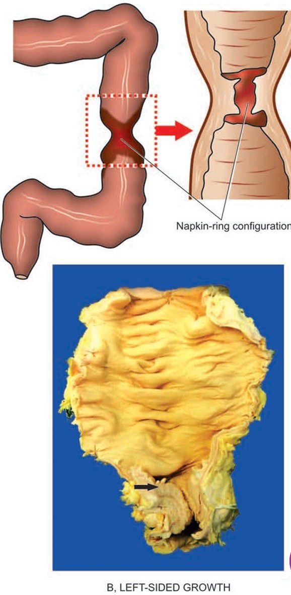 Left-sided growth—napkin-ring configuration with spread of growth into the bowel wall.