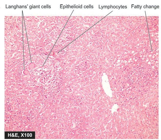 The hepatic parenchyma shows epithelioid granulomas with small areas of central necrosis and surrounded peripherally by Langhans’ giant cells and lymphocytes.