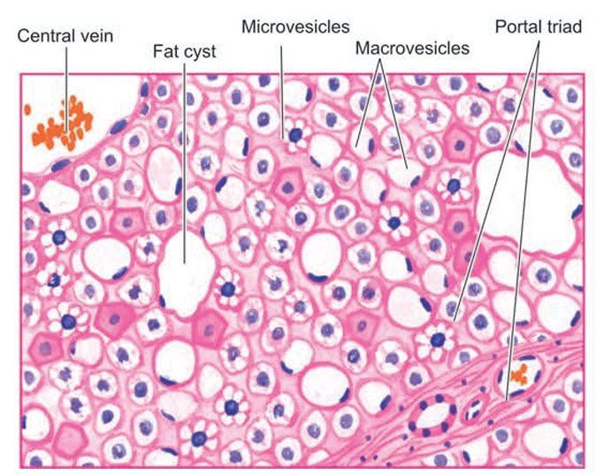 Most of the hepatocytes are distended with large lipid vacuoles with peripherally displaced nuclei.