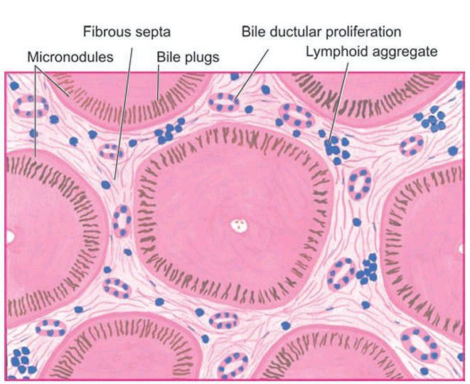 Primary biliary cirrhosis, diagrammatic representation. There are fibrous scars dividing the hepatic parenchyma into the micronodules. The fibrous septa contain prominent lymphoid infiltrate and proliferated bile ducts. Many of the hepatocytes contain elongated bile plugs.