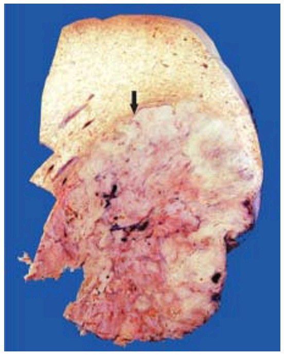 . Sectioned surface shows a single, large mass (arrow) with irregular borders and having central areas of necrosis, while rest of the hepatic parenchyma in the upper part of the picture shows many nodules of variable sizes owing to co-existent macronodular cirrhosis.