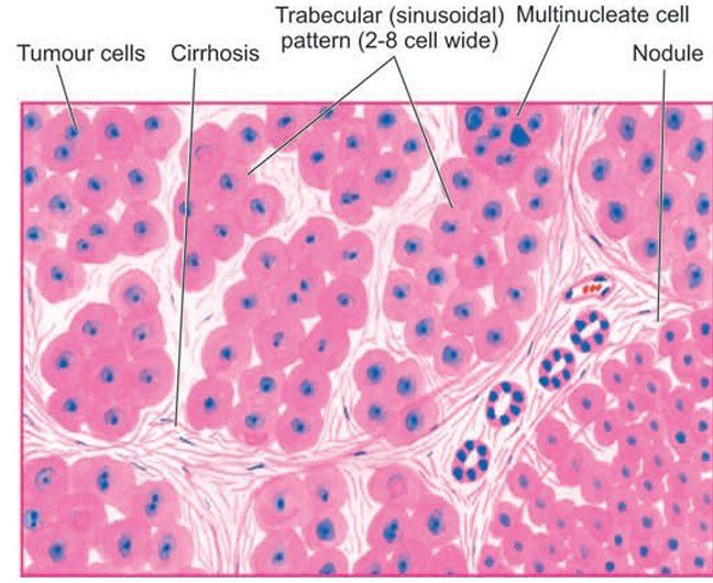 The tumour cells resembling hepatocytes show pleomorphism and are seen forming 2-8 cell wide trabeculae which are separated by endothelium-lined sinusoidal spaces.