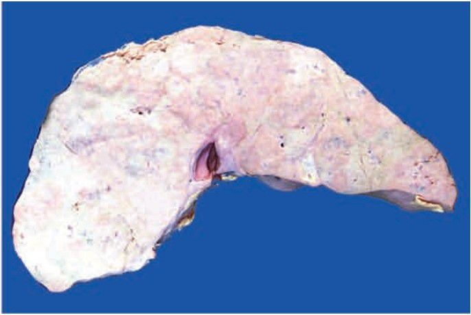 Metastatic tumour deposits in the liver as seen on sectioned surface. Characteristic features include multiple, variable-sized, nodular masses, often under the capsule, producing umbilication on the surface