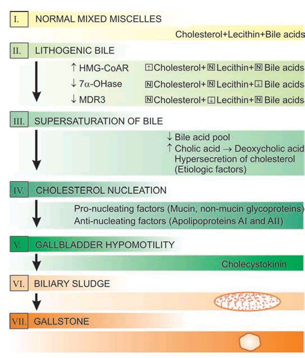 Schematic pathogenesis of gallstone formation. (HMGCoAR = hydroxy methyl glutaryl-coenzyme A reductase; 7α-OHase = cholesterol 7 α-OHase hydroxylase; MDR3 = multidrug resistanceassociated protein 3).