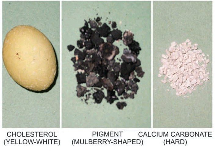 Pure gallstones of various types.