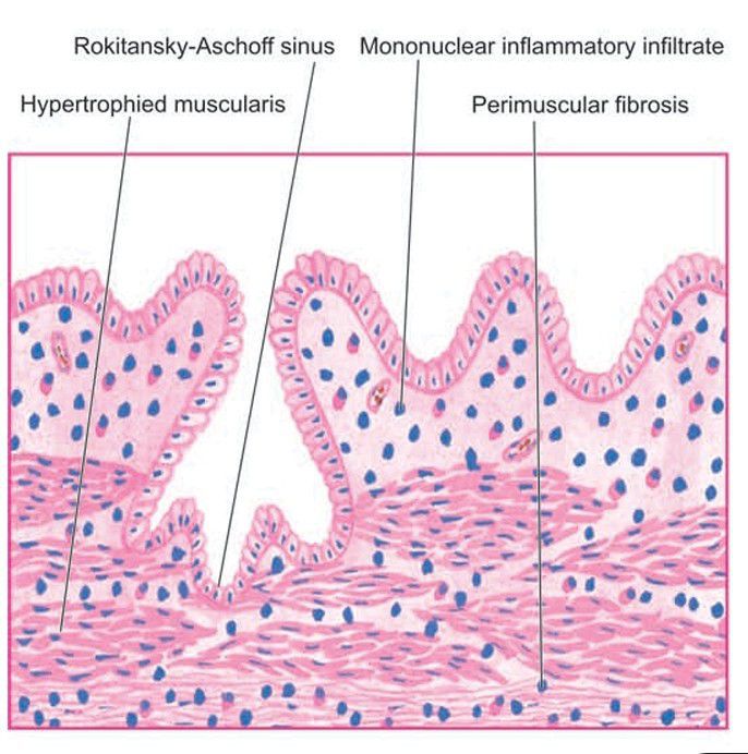 There is penetration of epithelium-lined spaces into the gallbladder wall (RokitanskyAschoff sinus) in an area. There is subepithelial and subserosal fibrosis and hypertrophy of muscularis. Mononuclear inflammatory cell infiltrate is present in subepithelial and perimuscular layers.