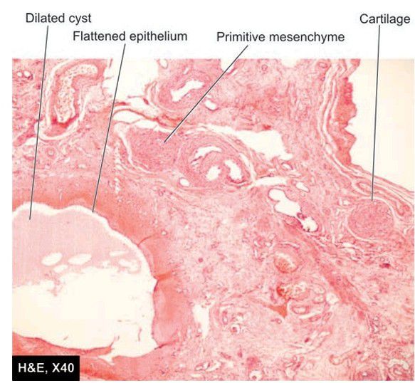 There are cysts lined by flattened epithelium while the intervening parenchyma consists of primitive connective tissue and cartilage.