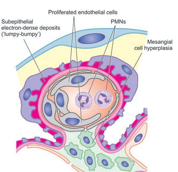 Acute glomerulonephritis, diagrammatic representation of ultrastructure of a portion of glomerular lobule showing characteristic electron-dense irregular deposits or ‘humps’ on the epithelial side of the GBM.