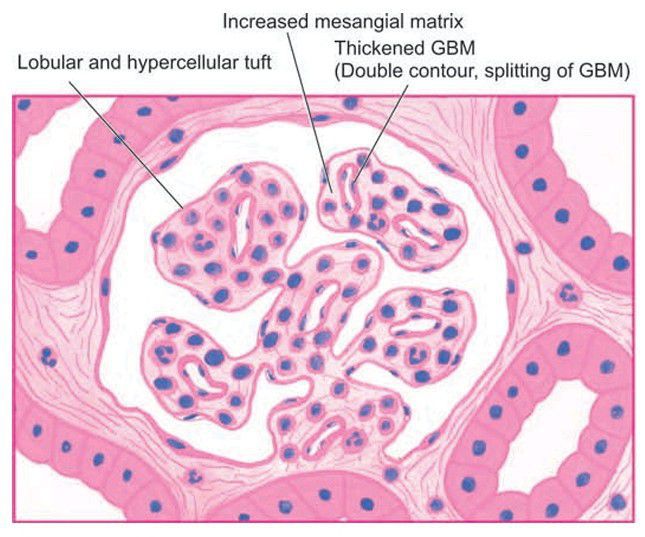 The glomerular tufts show lobulation and mesangial hypercellularity. There is increase in the mesangial matrix between the capillaries. There is widespread thickening of the GBM.