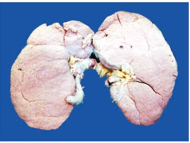 End-stage kidney, gross appearance of short contract kidney in chronic glomerulonephritis. The kidney is small and contracted. The capsule is adherent to the cortex and has diffusely granular cortical surface.