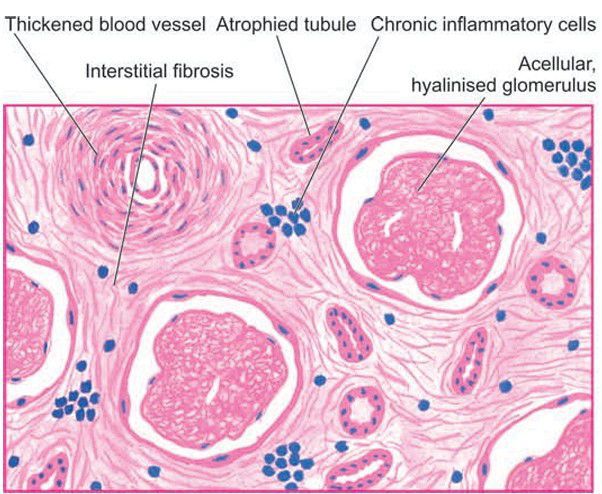 Glomerular tufts are acellular and completely hyalinised. Blood vessels in the interstitium are hyalinised and thickened while the interstitium shows fine fibrosis and a few chronic inflammatory cells.
