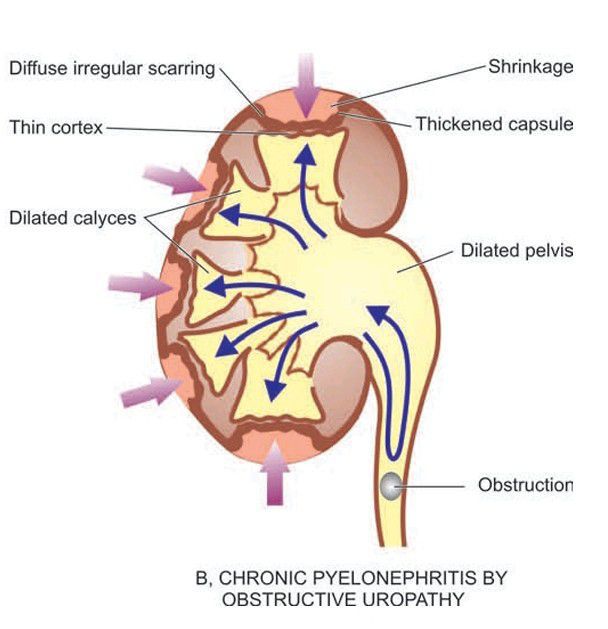 Obstructive pyelonephritis due to obstruction of the urinary tract causing high pressure backflow of urine and infection of all the papillae and consequent dif fuse scarring of the kidney and thinning of the cortex.