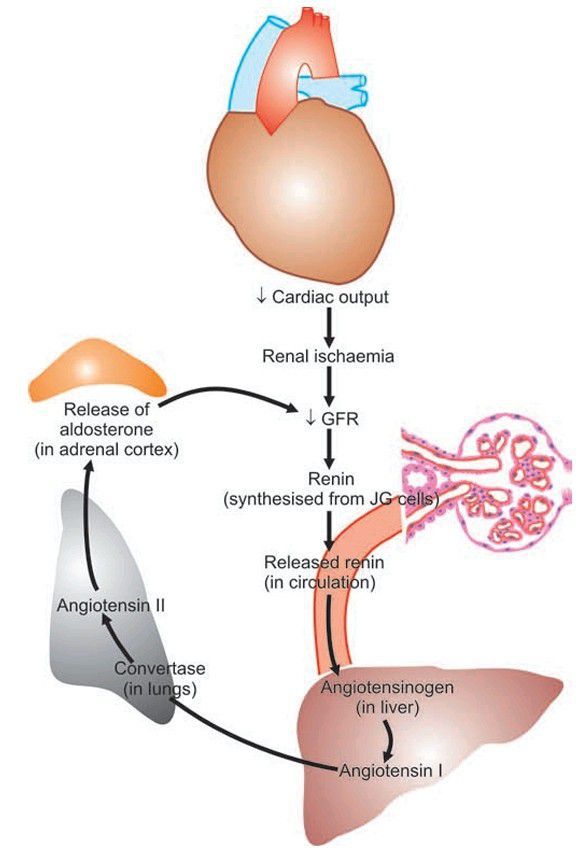 Control of blood pressure by altering plasma concentration of angiotensin II and aldosterone.