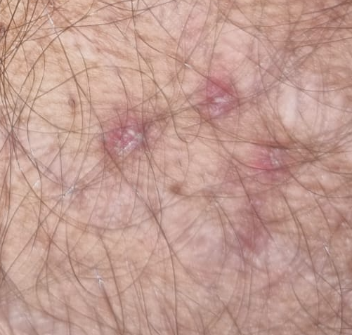 One of my friends has red itchy bumps on their right thigh. Itchy, no pain and no pus or discharge. Any idea as to what it could be.