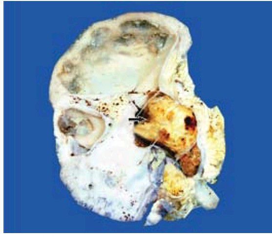 Staghorn renal stone with chronic pyelonephritis.The kidney is enlarged and heavy. The capsule is adherent to the cortex and has irregular scars on the surface. Sectioned surface shows dilated pelvicalyceal system with atrophied and thin peripheral cortex. The pelvis of the kidney contains a single, large, sof t yellow white stone t aking the contour of the pelvi-calyceal system (arrow).