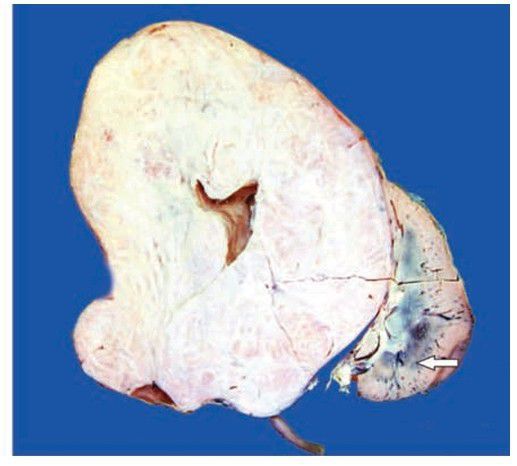 Nephroblastoma (Wilms’ tumour). The kidney is enlarged and has ovoid and nodular appearance. The sectioned surface shows replacement of almost whole kidney by the tumour leaving a thin strip of compressed renal tissue at lower end (arrow). Cut section of the tumour is gray white, fleshy and has small areas of haemorrhages and necrosis.
