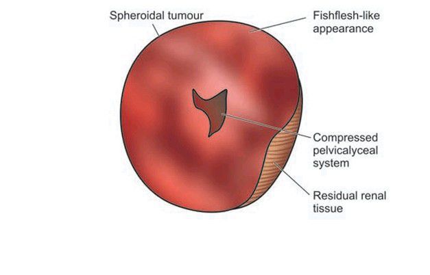 Nephroblastoma (Wilms’ tumour). The kidney is enlarged and has ovoid and nodular appearance. The sectioned surface shows replacement of almost whole kidney by the tumour leaving a thin strip of compressed renal tissue at lower end