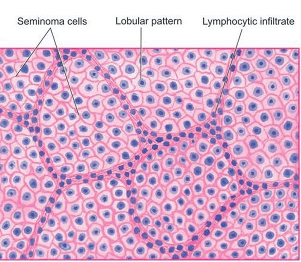 . Microscopy of the tumour shows lobules of monomorphic seminoma cells separated by delicate fibrous stroma containing lymphocytic infiltration.