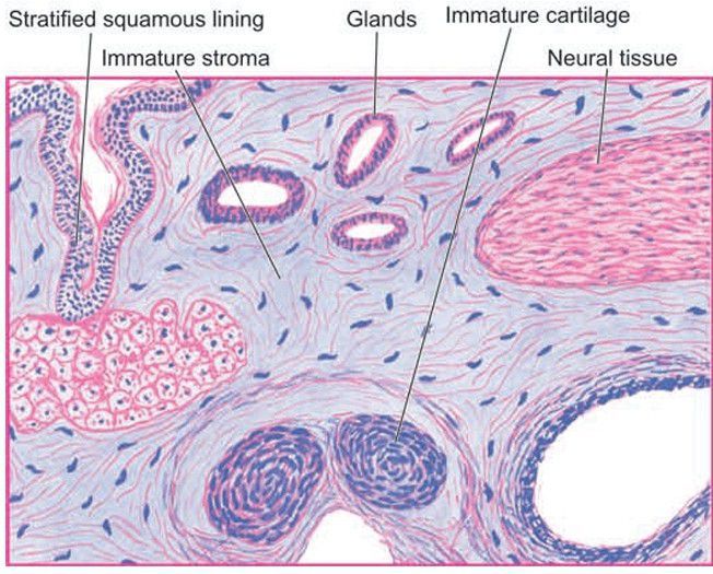 Microscopy shows a variety of incompletely differentiated tissue elements.