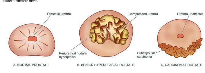 Normal prostate, benign nodular hyperplasia and prostatic carcinoma. The nodule in case of benign nodular hyperplasia (B) is located in the inner periurethral part and compresses the prostatic urethra while prostatic carcinoma (C) generally arises in the peripheral glands and, thus, does not compress the urethra.