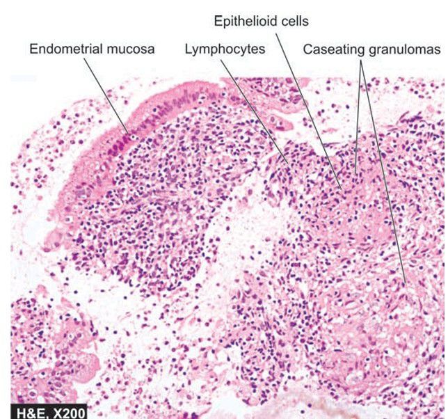 The stroma has caseating epithelioid cell granulomas having Langhans’ giant cells and peripheral layer of lymphocytes.