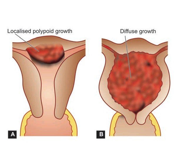 A, B, Diagrammatic representation of the common gross patterns—localised polypoid growth and diffuse growth.