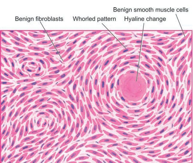 . Microscopy shows whorls of smooth muscle cells which are spindle-shaped, having abundant cytoplasm and