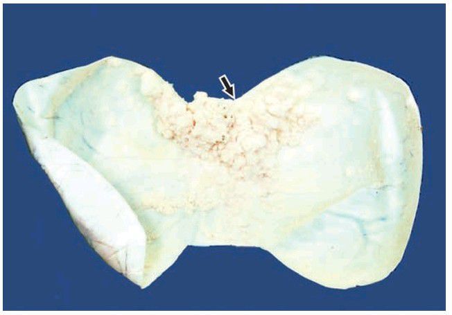 It shows an enlarged ovary replaced with a large unilocular cyst with intracystic papillae (arrow).