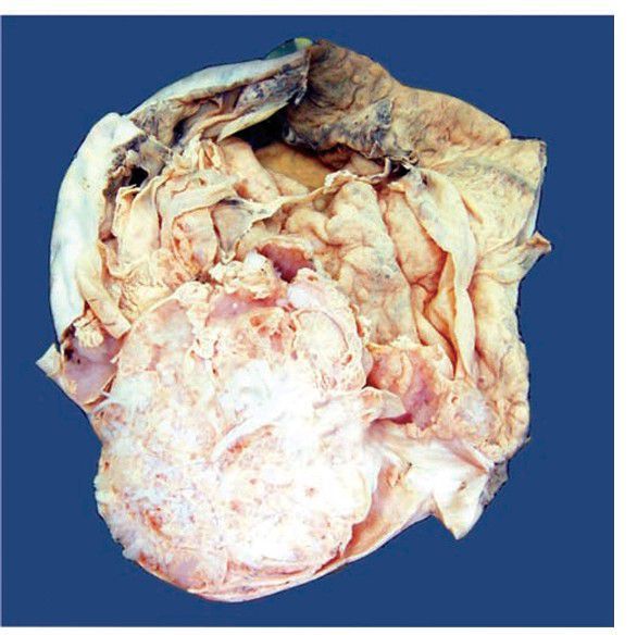 Cut surface shows a very large multilocular cyst without papillae. The cyst wall shows presence of loculi containing gelatinous mucoid material.