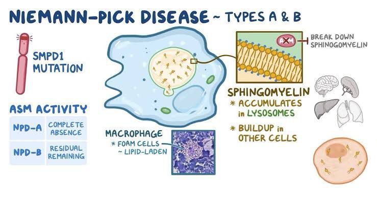 Niemann-Pick disease types A and B are both caused by changes in the SMPD1 gene. The condition is sometimes called acid sphingomyelinase deficiency (ASMD). With these gene changes, an enzyme called sphingomyelinase (sfing-go-MY-uh-lin-ase) is missing or doesn't work well.