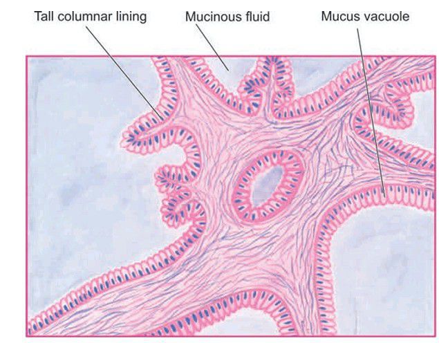 The cyst wall and the septa are lined by a single layer of tall columnar mucin-secreting epithelium with basally-placed nuclei and large apical mucinous vacuoles