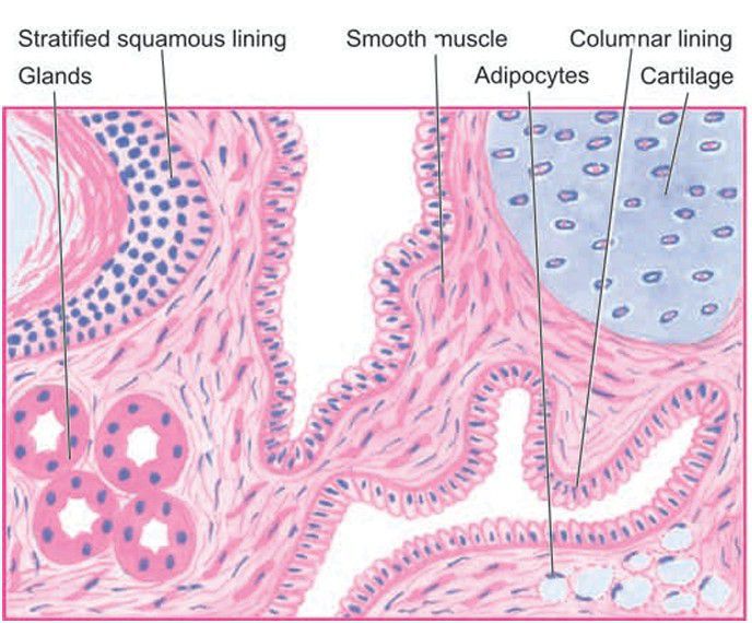 . Microscopy shows characteristic lining of the cyst wall by epidermis and its appendages. Islands of mature cartilage are also seen.