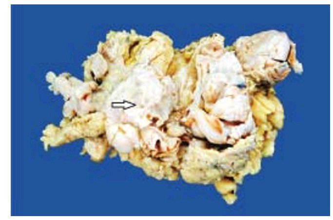 Simple mastectomy specimen shows replacement of almost whole breast with a large circumscribed, greywhite, firm, nodular mass having slit-like, compressed cystic areas (arrow) and areas of haemorrhage.