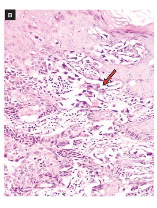 There are clefts in the epidermal layers containing large tumour cells (arrow).