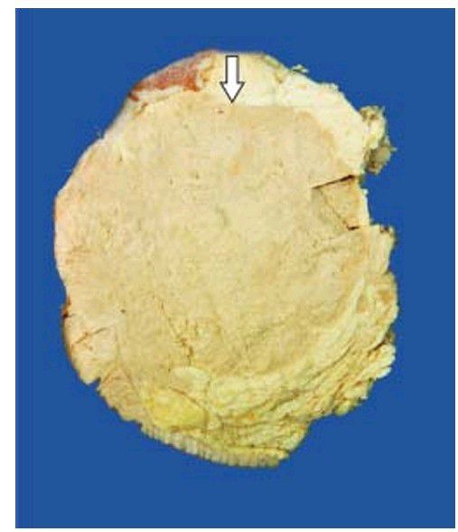 Cut surface of the breast shows a large grey white soft fleshy tumour replacing almost whole of the breast. The tumour is somewhat delineated from the adjacent breast parenchyma (arrow) as compared to irregular margin of IDC.