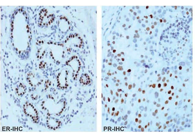 Oestrogen and progesterone hormonal receptors (ER and PR) in breast cancer.