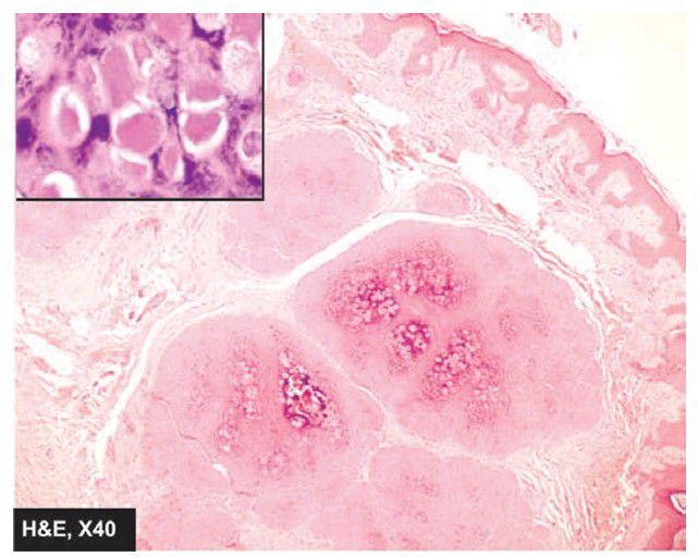 The epidermal layers show numerous molluscum bodies which are intracytoplasmic inclusions. Inset shows close-up view of molluscum bodies.